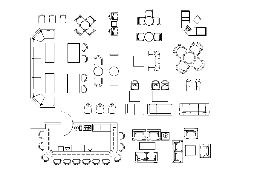 Kitchen plan and furniture detail dwg file, Kitchen plan with stove, sink, dining table detail and furniture detail with sofa, chair, table, etc.