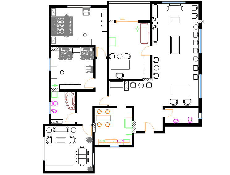 Bungalow plan detail dwg file, Bungalow plan detail with dimension detail, naming detail, furniture detail with chair and table detail, bed, dining table, etc.