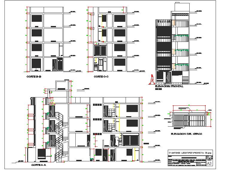 Elevation and section detail dwg file, Elevation and section detail with dimension detail, naming detail, level dimension detail, stair cutting detail, etc.