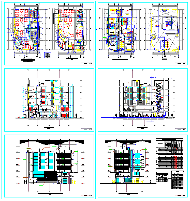 This hotel AutoCAD drawing presents a complete architectural design featuring detailed floor plans, sectional drawings, and elevation views of a multi-storey structure. Each floor layout is clearly designed to accommodate various facilities such as reception areas, guest rooms, dining spaces, and service corridors. The plan demonstrates structural alignment with precise column grids, wall thickness, and circulation paths. The use of color-coded sections enhances visualization and clarity for architectural and engineering planning.
