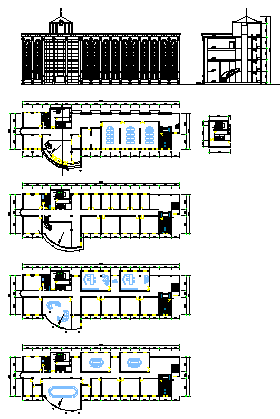 Here the European office building design drawing with Plan design drawing, Front elevation design drawing, Section design drawing in this auto cad file.