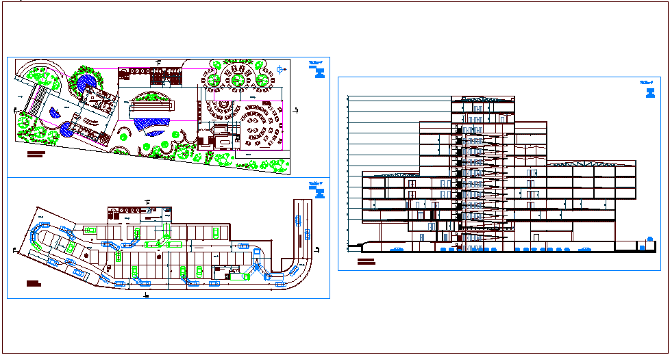 and low level plan with view of road,tree and flooring view and student welfare information center and exterior dining area and section view of university building with necessary dimension.