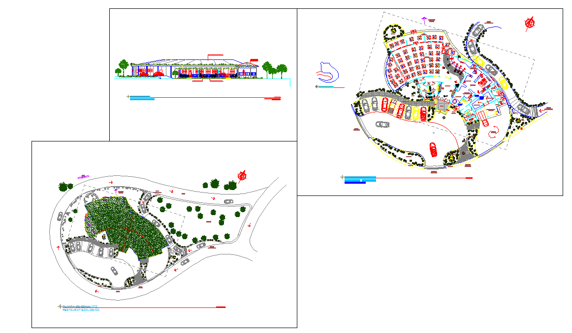 This restaurant AutoCAD design showcases a complete architectural layout with detailed floor plans, sectional elevation, and a well-organized site plan. The design highlights multiple dining zones, entry and exit paths, parking areas, and landscaped surroundings. The measured site layout displays vehicle circulation routes, open-air seating, service areas, and pedestrian walkways. The elevation view includes façade detailing and window placements, giving the restaurant a modern architectural appeal. Every structural and spatial element is drafted with accuracy for efficient design execution.