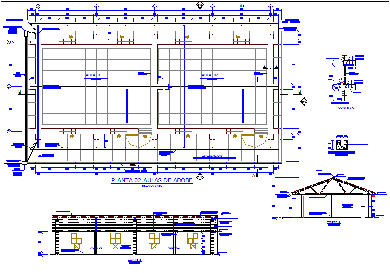 with area distribution and view of wall view and two classroom view and circulation view of school area with elevation and section view with necessary dimension.