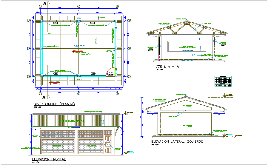 Classroom distribution plan,elevation and section view for school dwg file in plan