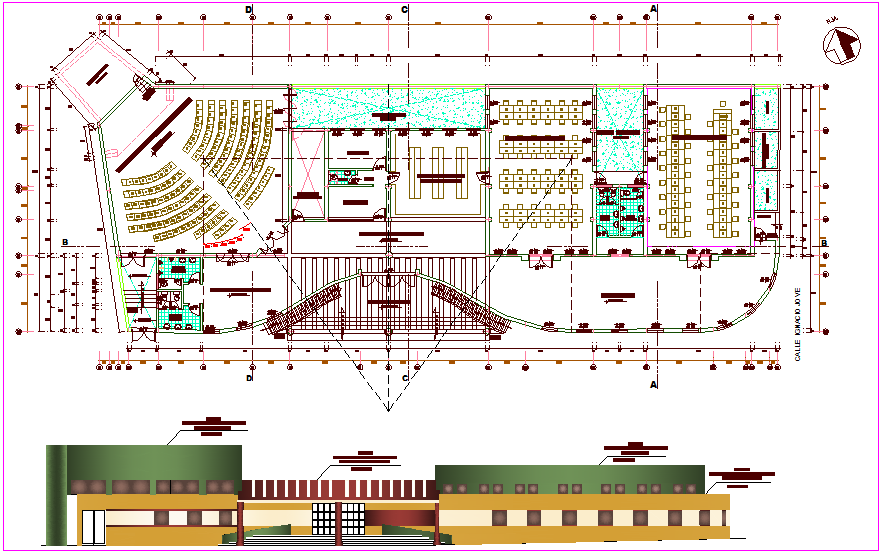 Education building plan,elevation dwg file in plan with area distribution and wall,entry way,library and exhibition and audiovisual room,computer room,director office and