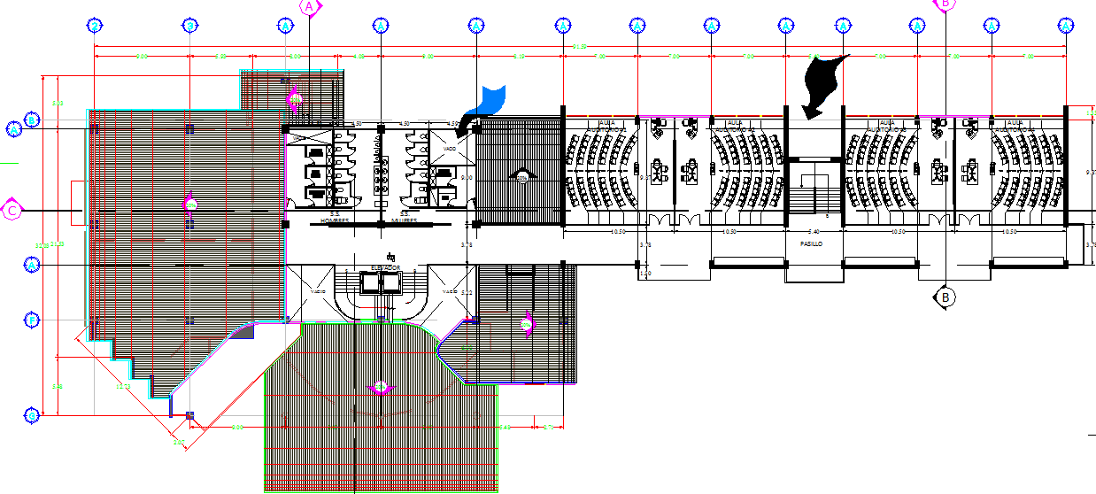 Graduate studio layout plan dwg file, big layout , auditorio seating , furniture detailing in auto cad format