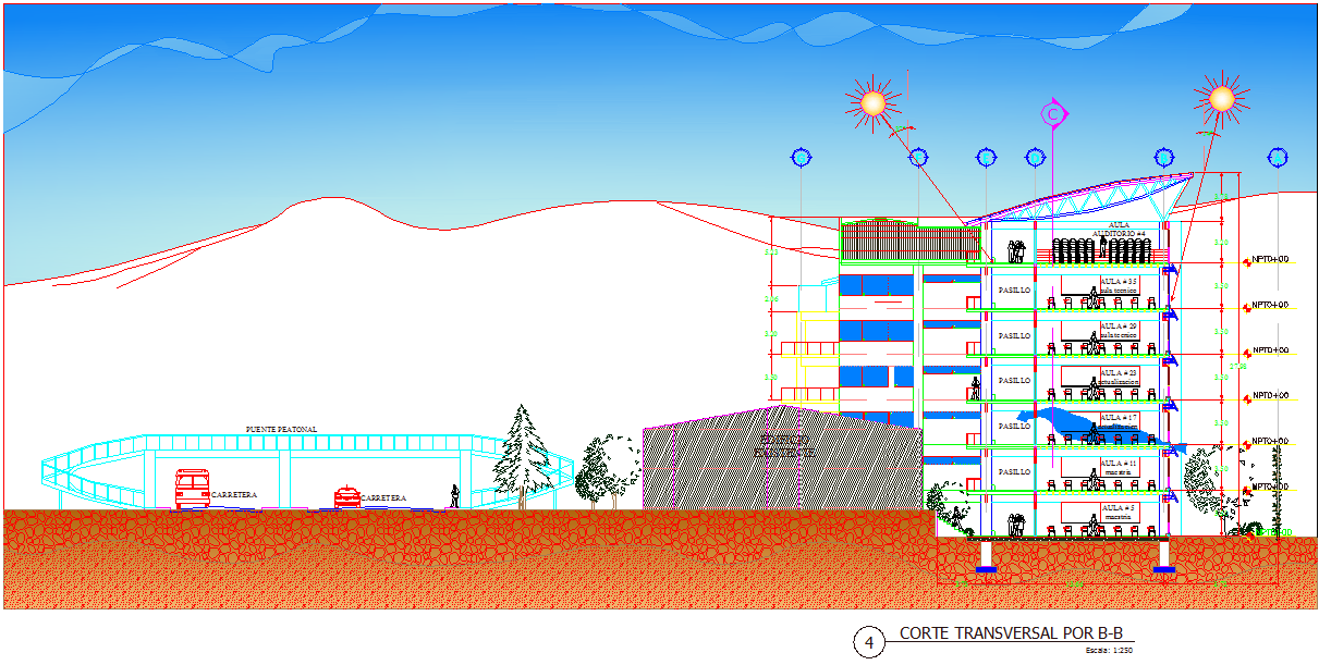 Education institution elevation layout dwg file, here there is a 2d elevation of institute , sectional detail . car parking detail, human figure detailing