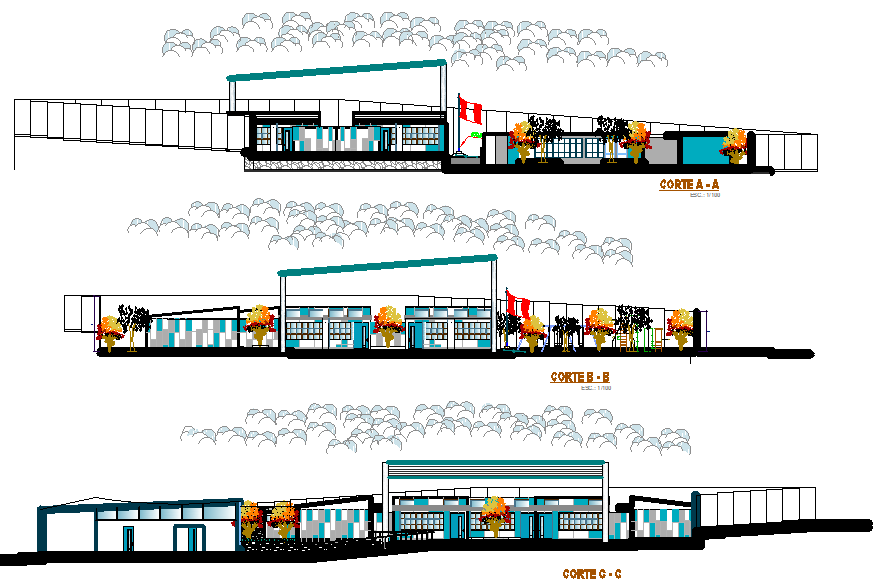 Section detail dwg file, Section detail with naming detail, both side tree detail, galss detail, main gate detail with section A-A’ detail with flag detail, section B-B’ with detail window and door detail, section C-C’ detail 12 feet high main gate detail, etc.