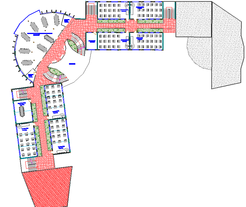 Round plan layout building detail dwg file, Tress floor Round plan layout building detail with dimension detail, naming detail, furniture detail with chair, table, stair detail, hall detail, resection table detail, toilet detail, etc.