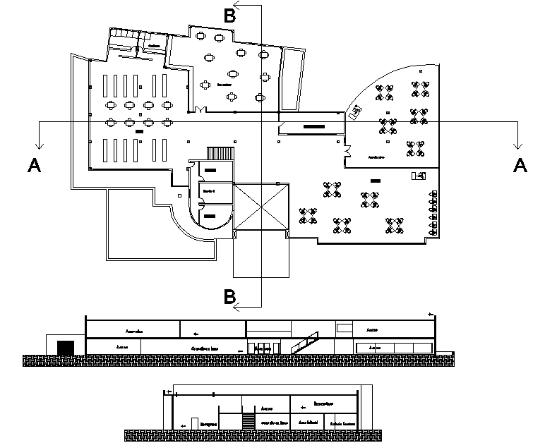 Commercial plan and elevation detail dwg file, Commercial plan with furniture detail, chair, table, section line detail, elevation detail with stair detail, hall detail, etc.