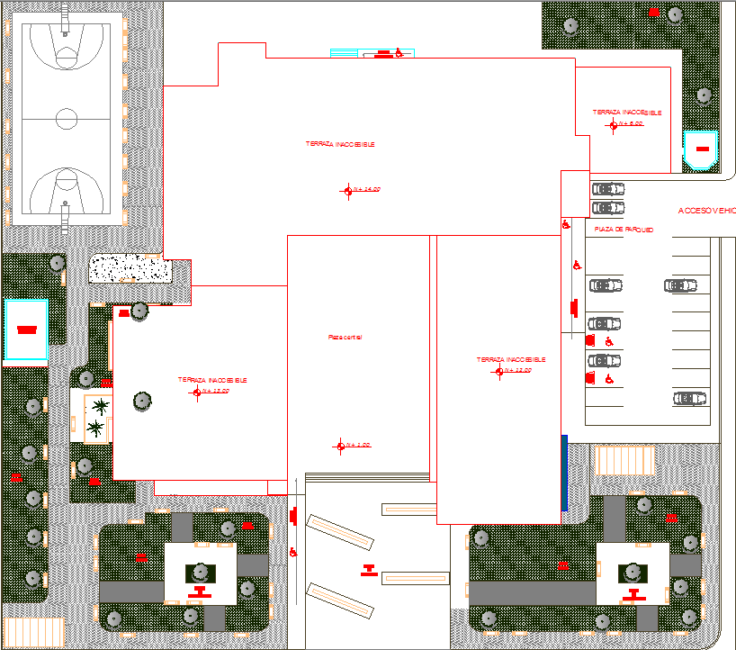 Plot commercial plan detail dwg file, Layout commercial plan detail with level detail, naming detail, landscaping detail, section line detail, car parking detail, etc.