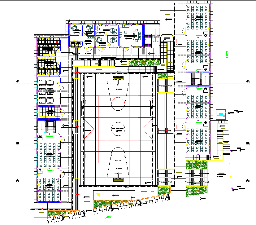 commercial plan detail dwg file, Working commercial plan detail with naming detail, landscaping detail, section line detail, furniture detail with chair and table detail, car parking detail, toilet detail, theater detail, badminton detail, etc.