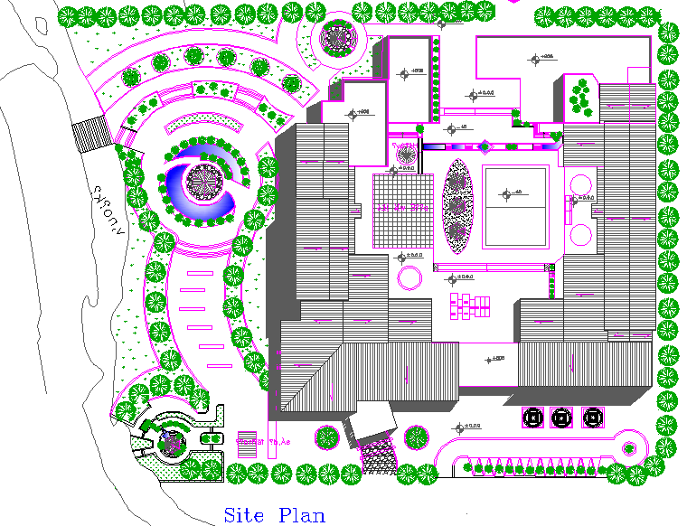Layout commercial plan and landscaping detail dwg file, Layout commercial plan detail with naming detail, hatching detail, section line detail, plant and tree detail, car parking detail, etc.