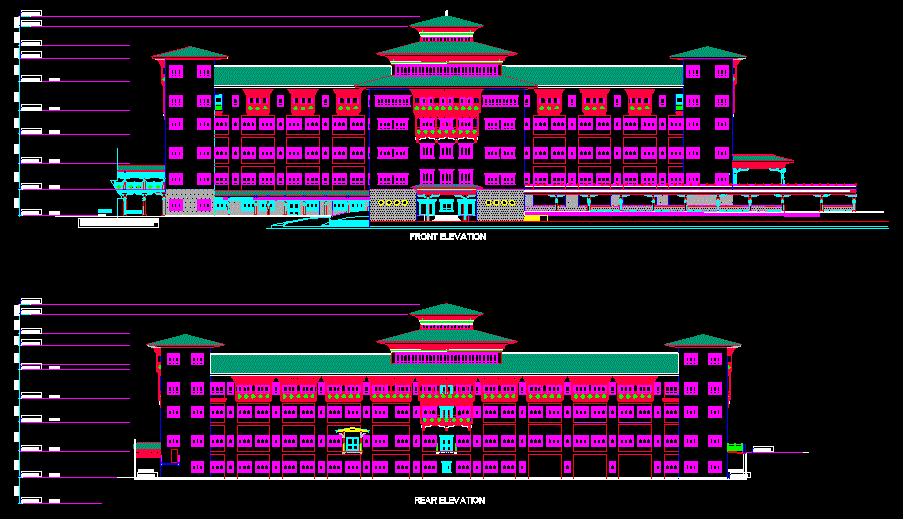 G plus 4 Hospital Front and Rear Elevation Design in CAD File