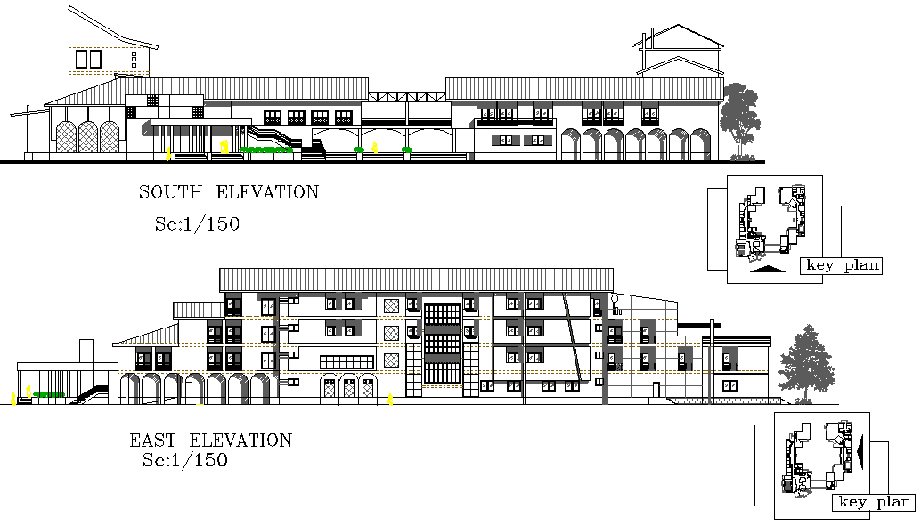 East elevation and south elevation detail dwg file, East elevation and south elevation detail with key plan detail, main gate detail, window detail, stair detail, etc.