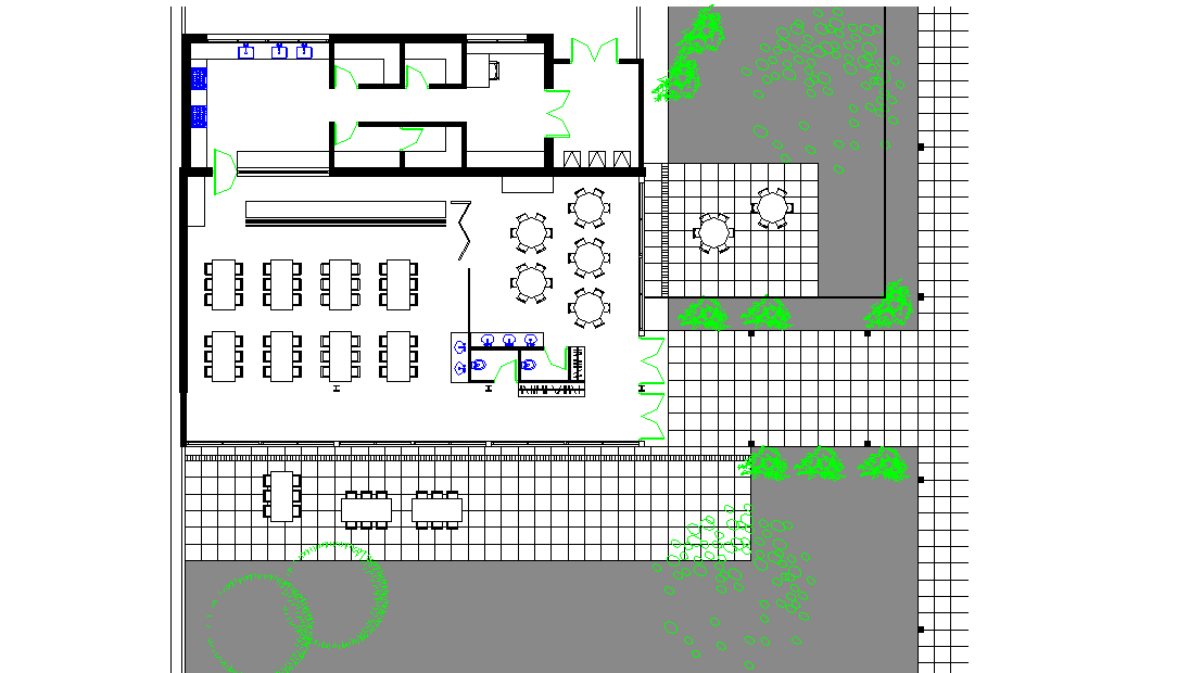 Office plan detail dwg file, office plan detail with landspecing detail, plant and tree detail, furniture detail with table and chair detail, etc.