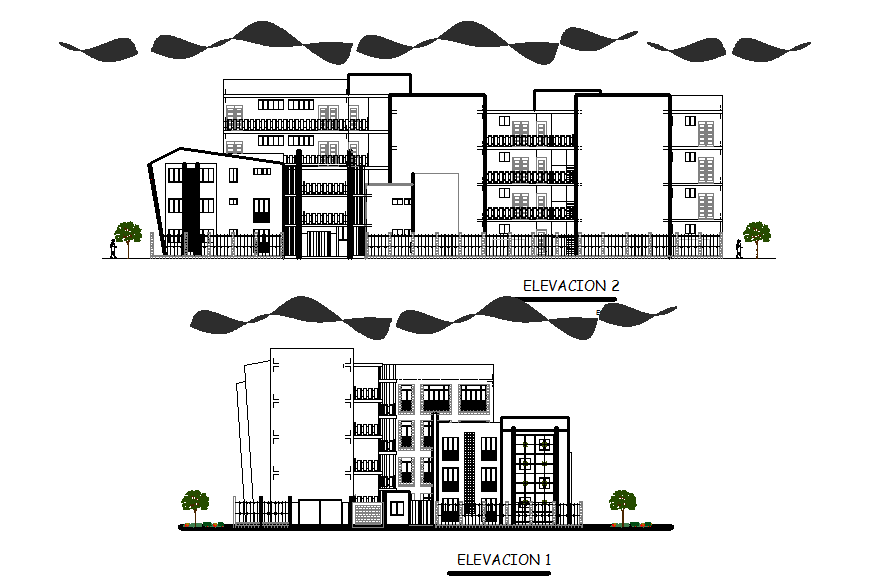 School elevation detail dwg file, School elevation detail with front elevation detail, back elevation detail, working plan detail, reeling detail, furniture detail door, window detail, both side tree and plant detail, greel detail, etc.