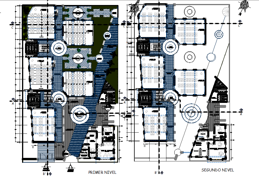 Layout commercial plan detail dwg file, Layout commercial plan detail with naming detail, section line detail, section line detail, furniture detail with chair and table detail, car parking detail, toilet detail, theater detail, tree and plant detail, etc.