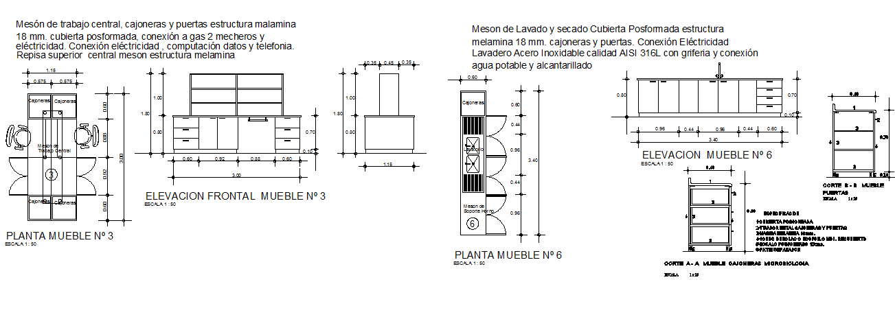 Furniture detail dwg file, Furniture detail with dimension detail, naming detail, cub board, table, drover detail, chair, plan and elevation, section detail, etc.