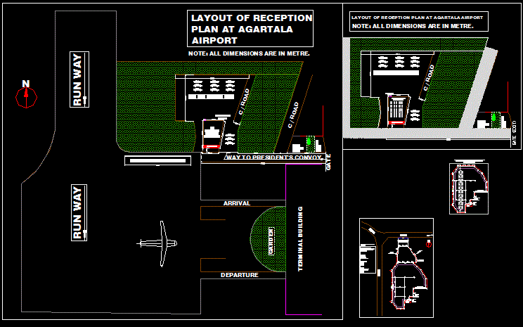 Explore the airport layout and terminal site plan in a CAD drawing file featuring runway layout, terminal design, and taxiway structure for aviation planning projects.