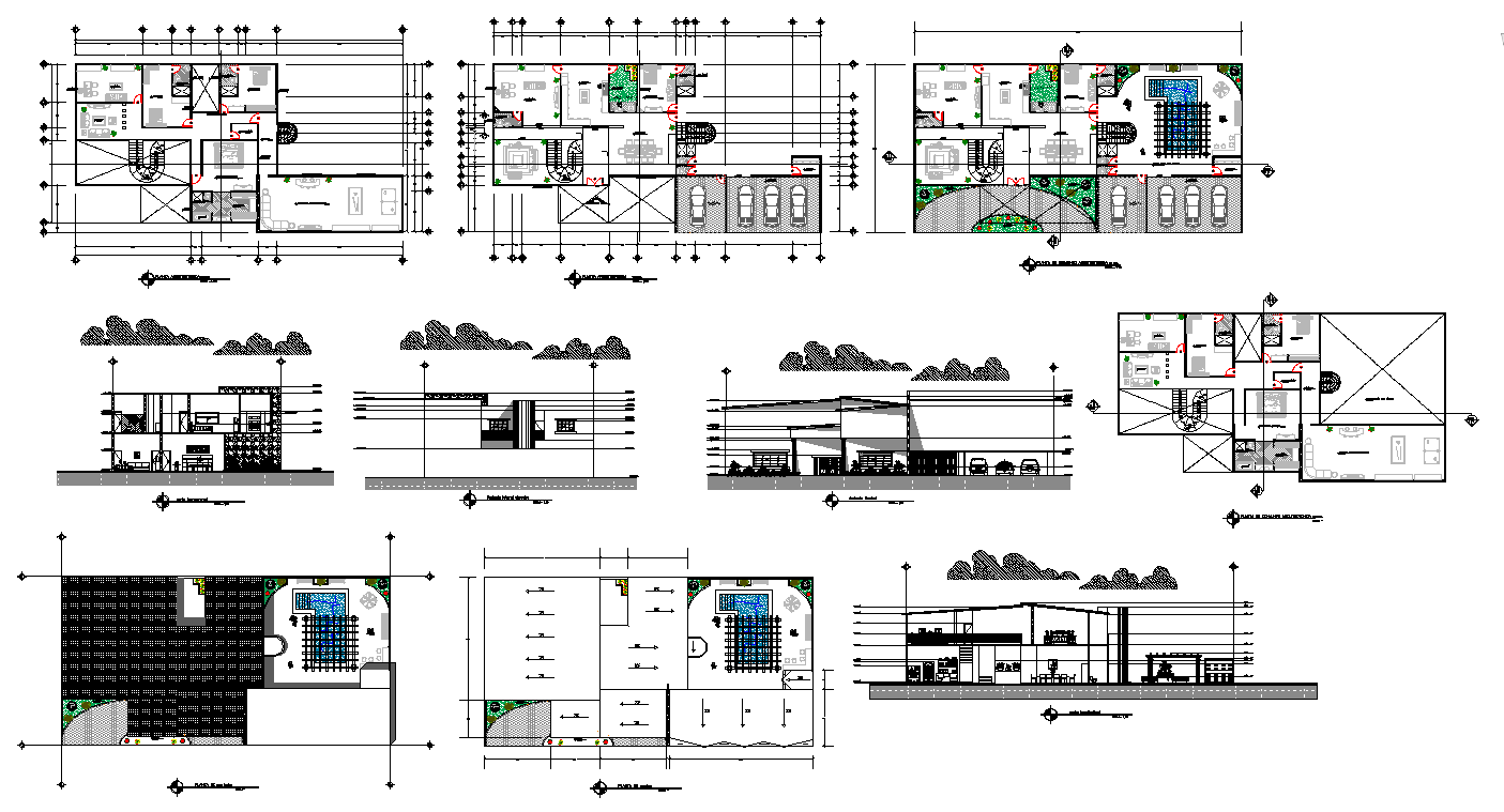 This 20x30m residence home detail DWG includes a complete architectural layout with clearly drafted floor plans, sectional drawings, and elevation details. The design features spacious living areas, bedrooms, kitchen spaces, landscaped zones, and multiple circulation paths shown across the upper and lower levels. The drawing also includes interior planning with furniture placements, ensuring a practical understanding of space usage. The front and side elevations provide a full visual representation of façade elements, including glazing, roof lines, shading structures, and exterior finishes.