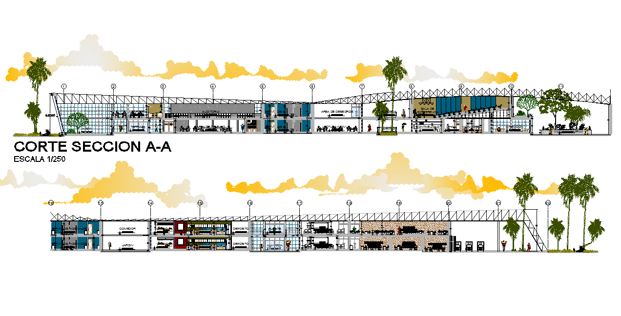 Section detail dwg file, Section detail with scale 1:250, naming detail, both side tree detail, galss detail, main gate round shape detail with section A-A’ detail with window and reeling detail, etc.