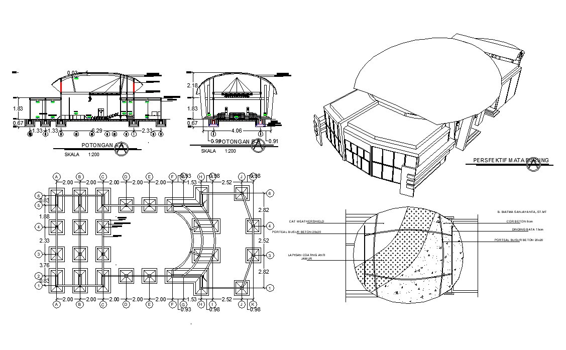 Construction detail dwg file, center line plan, foundation plan detail with naming detail and dimension detail, roof plan detail in naming an dimension detail , beam detail in reinforcement detail in dimension detail and naming detail, reinforcement table detail, etc.