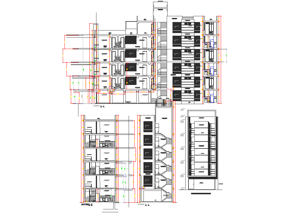 Section detail dwg file, Section detail with key plan detail, naming detail, both side tree detail, galss detail, main gate detail with section A-A’ detail with stair cutting detail, section B-B’ with detail window and door detail, etc.