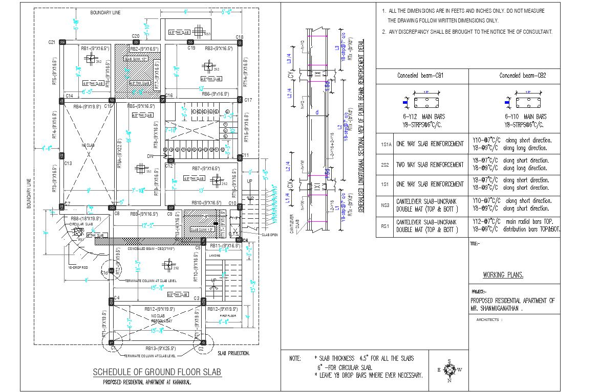 Schedule of ground floor slab detail dwg file, Schedule of ground floor slab detail with dimension detail, naming detail, beam section detail with dimension detail, naming detail, reinforcement detail, column and beam section detail, etc.