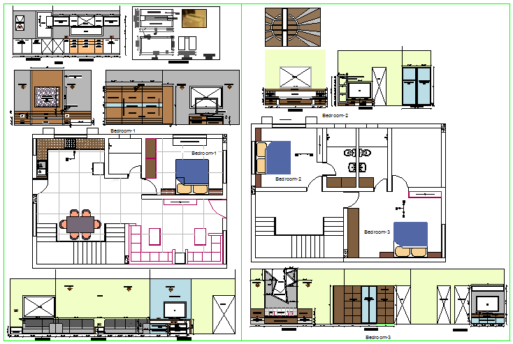 The DWG file also contains multiple interior elevation drawings that showcase wall designs, wardrobe elevations, kitchen cabinet profiles, and staircase detailing. These elevations provide height levels, material layers, and structural references needed for carpenters, designers, and contractors during fabrication. Additional details such as ventilation points, opening sizes, and interior partitions help ensure clear understanding of design components. This drawing is an ideal resource for architects, interior designers, civil engineers, and students involved in residential design development. It supports concept planning, presentation work, and construction-ready detailing for interior spaces.