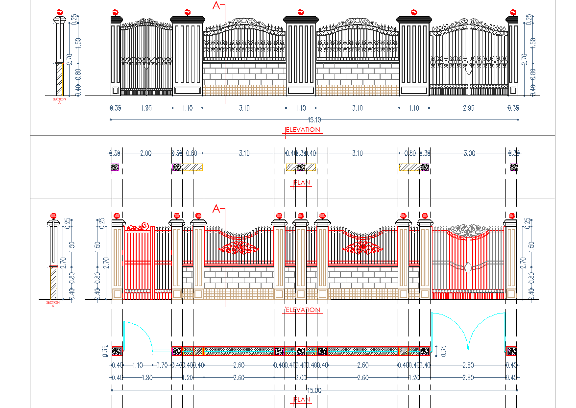 Boundary wall specifications detail dwg file, Boundary wall specifications detail with dimensions, boundary wall elevation detail