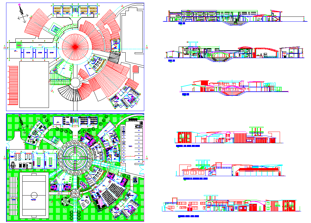 This circular campus building DWG file provides a highly detailed architectural layout featuring complete floor plans, radial block arrangements, landscaped pathways, parking bays, entry zones, and integrated outdoor activity areas. The central circular core is surrounded by classrooms, administrative units, meeting halls, and specialized activity rooms. Each segment is fully dimensioned, with gridlines, wall details, service corridors, and circulation routes clearly represented. The drawing also includes outdoor sports areas, green planning zones, and connecting walkways to support academic institutional design. The upper sheet captures the main plan with sectional indicators, and the lower sheet includes the full site development plan enhanced with landscape elements.