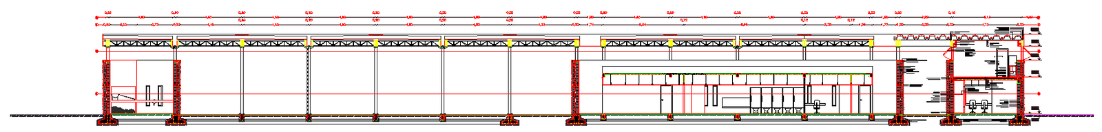This Industrial Building Section DWG file presents a fully detailed structural drawing suitable for architectural and civil engineering documentation. The section includes complete measurement markings across the elevation, showing precise beam to beam spacing, column centerline distances, roof truss placement, and base foundation levels. Each structural bay is dimensioned in meters, ensuring accuracy during construction planning and site execution. The drawing also features wall thickness details, intermediate supports, slab levels, and vertical alignment markers for load-bearing components. All measurements are clearly indicated using professional drafting standards, making this drawing ideal for engineers and designers who require high-quality reference sections.
