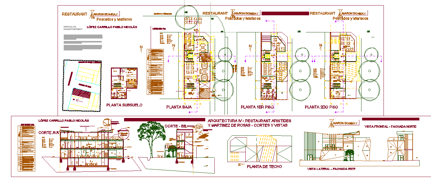 This Restaurant Building DWG provides a complete architectural layout with detailed measurements for basement, ground floor, first floor, and second floor levels. Each plan includes accurately scaled dining areas, kitchen layouts, circulation routes, service rooms, washrooms, and utility connections. The drawing also features subsuelo and planta baja plans with room labels, furniture arrangements, and access points for both customers and staff. Trees, site markings, and north orientation symbols are included for proper site positioning. Staircase dimensions, column locations, wall thicknesses, and detailed room zoning offer a clear understanding of the building’s functional flow.
