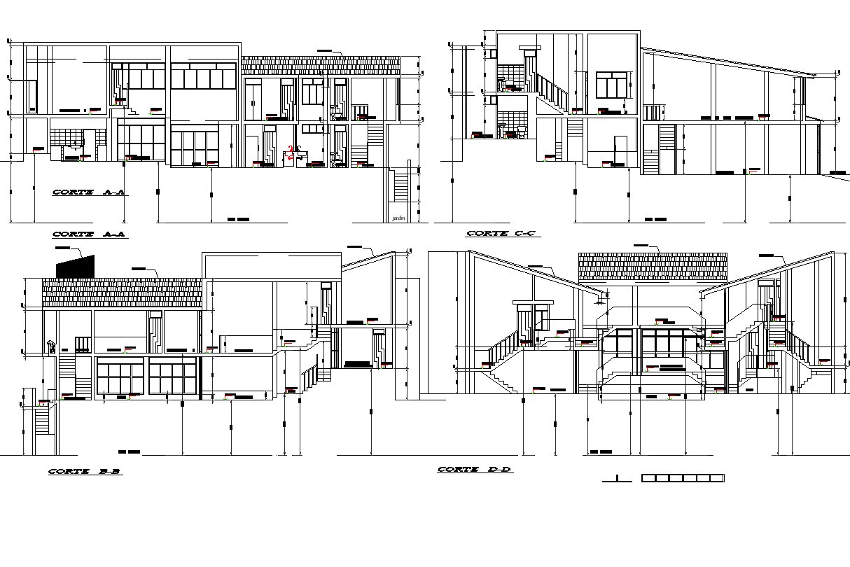 Section detail dwg file, Section detail with naming detail, dimension detail, section A-A’ detail siting table detail and bedroom detail, section B-B’ detail stair cutting detail, section C-C’ detail with door and window detail, front elevation detail and lateral elevation detail, etc.