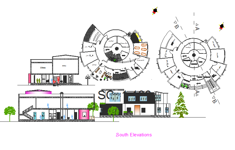 Round shape plan and elevation detail dwg file, Round shape plan and elevation detail with section line detail, both side tree detail, etc.