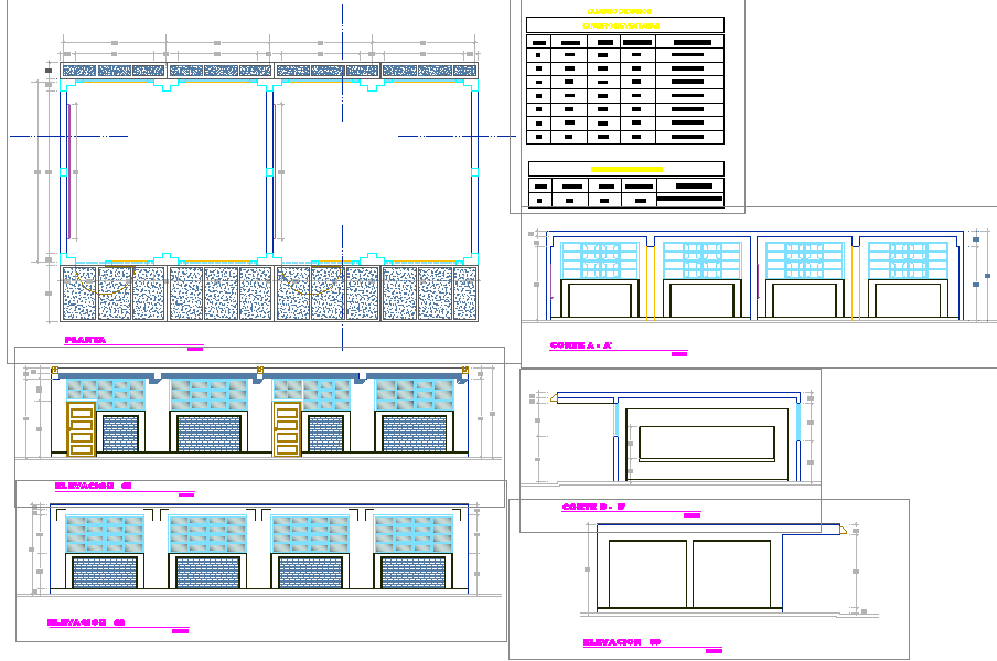 Elevation and section detail dwg file, elevation with frontal elevation and lateral elevation detail and class room section A-A’ detail and section B-B’ detail, dimension detail, naming detail, furniture detail with door, window, main gate elevation detail, etc.