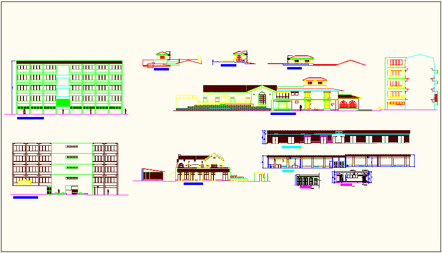 Elevation view with different elevation detail of university building dwg file