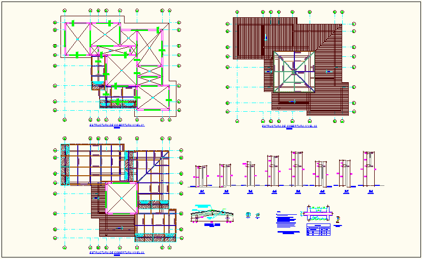 Coverage structure floor plan with structural detail for education center dwg file in first floor plan with view of area distribution and wall view and wood support view with column detail