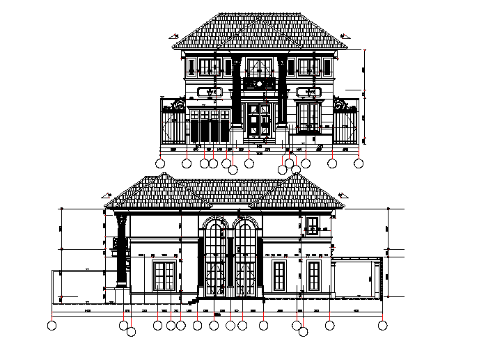 Front elevation and back elevation detail dwg file, Front elevation and back elevation detail with dimension detail, naming detail, roof elevation detail, main gate detail, door and window detail, etc.