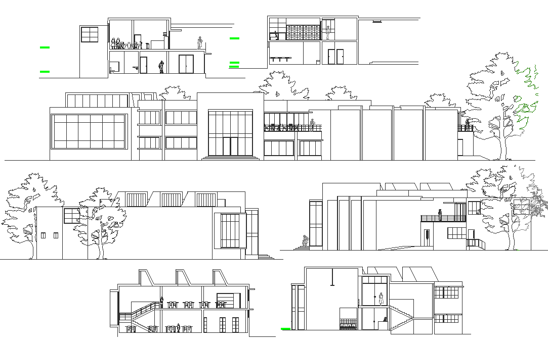 Elevation and section detail dwg file, Elevation and section detail with naming detail, both side tree detail, reeling detail, door and window detail, stair detail, etc.