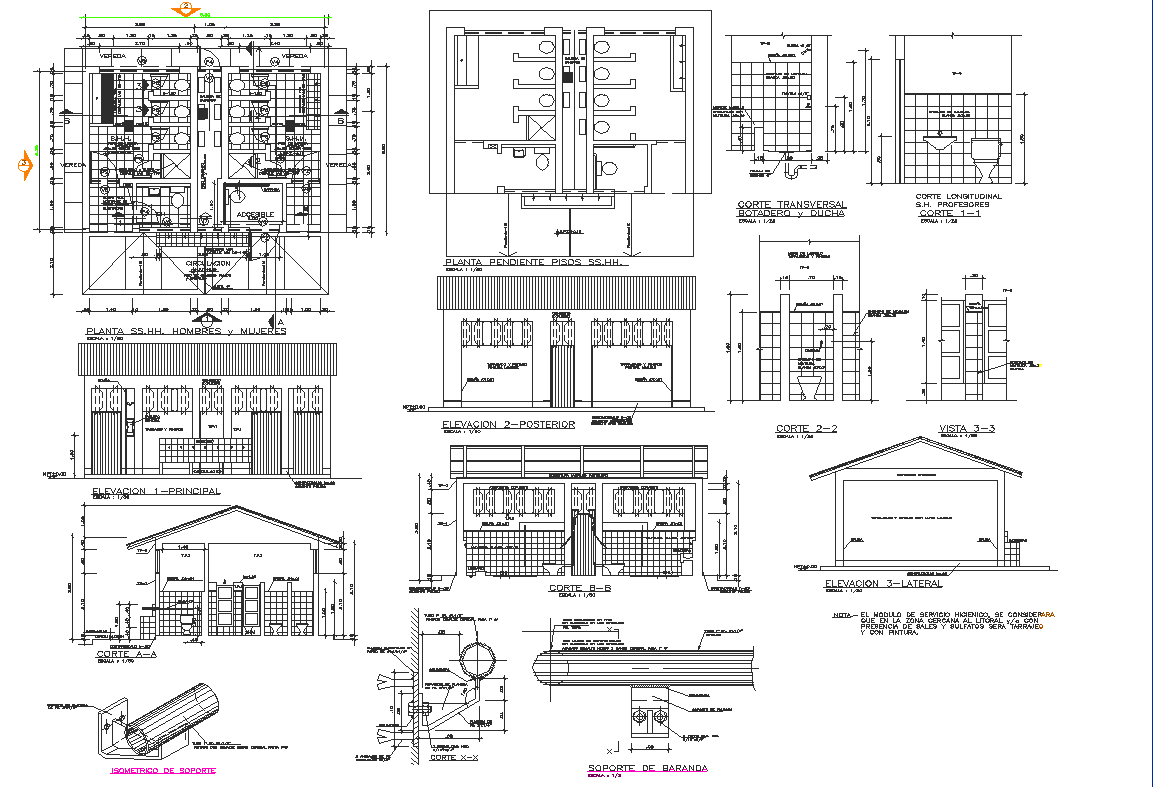 Commercial building plan, elevation and section detail dwg file