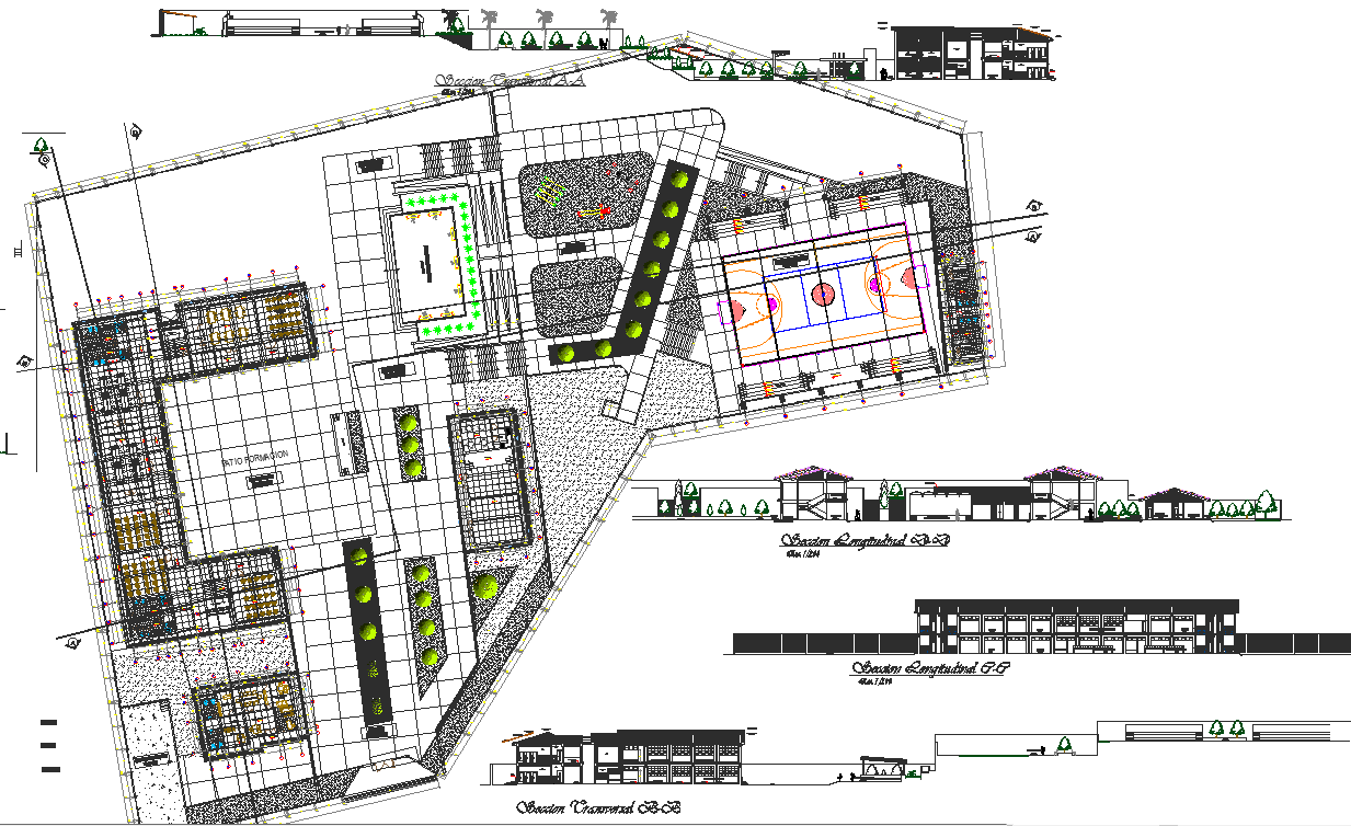 Commercial plan and elevation layout detail dwg file, Commercial plan and elevation layout detail with dimension detail, naming detail, landscaping detail with plant and tree detail, section line detail, etc.