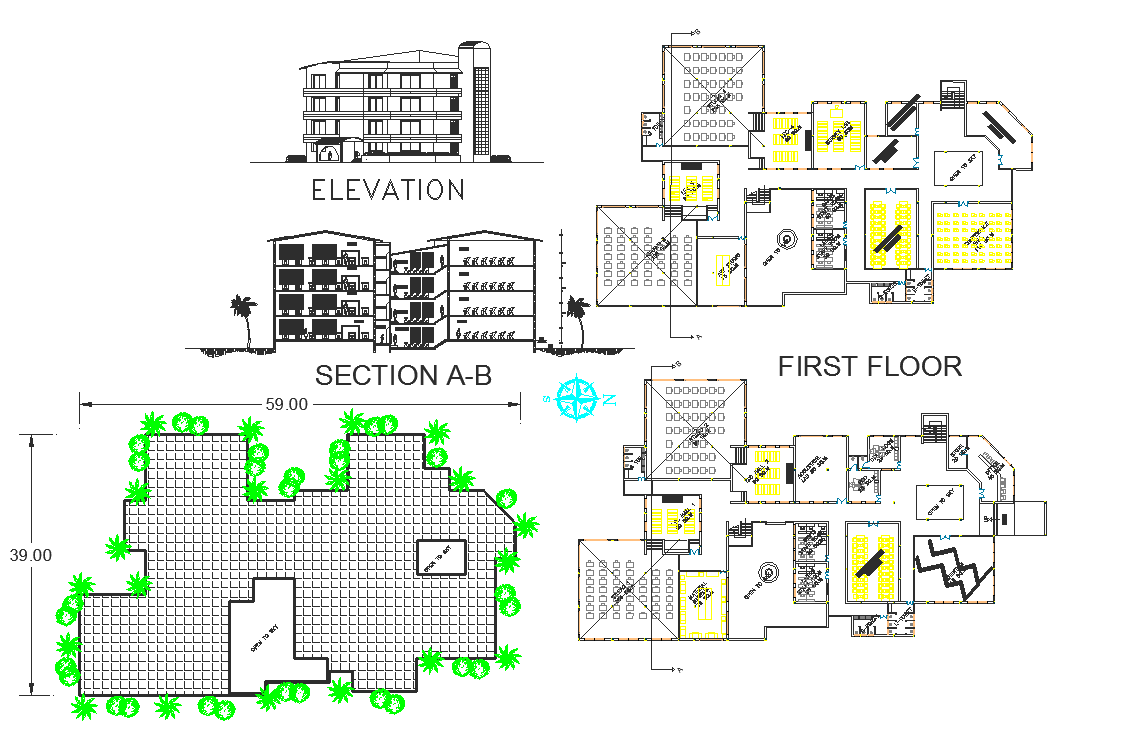 Plan, elevation and section detail dwg file, Plan, elevation and section detail with dimension detail, naming detail, center line plan detail with numbering detail, section detail with stair cutting detail, etc.