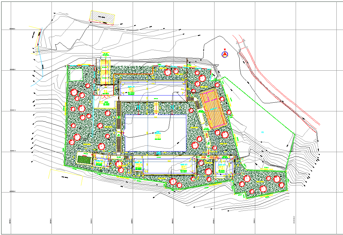 Contour layout plan detail dwg file, Contour layout plan detail with dimension detail, naming detail, north direction detail, landscaping detail with plant and tree detail, etc.