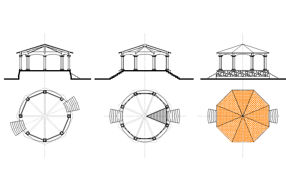 Park garden roof shade and seating arrangements structure plan elevation detail view dwg file, Park garden roof shade and seating arrangements structure plan elevation detail view