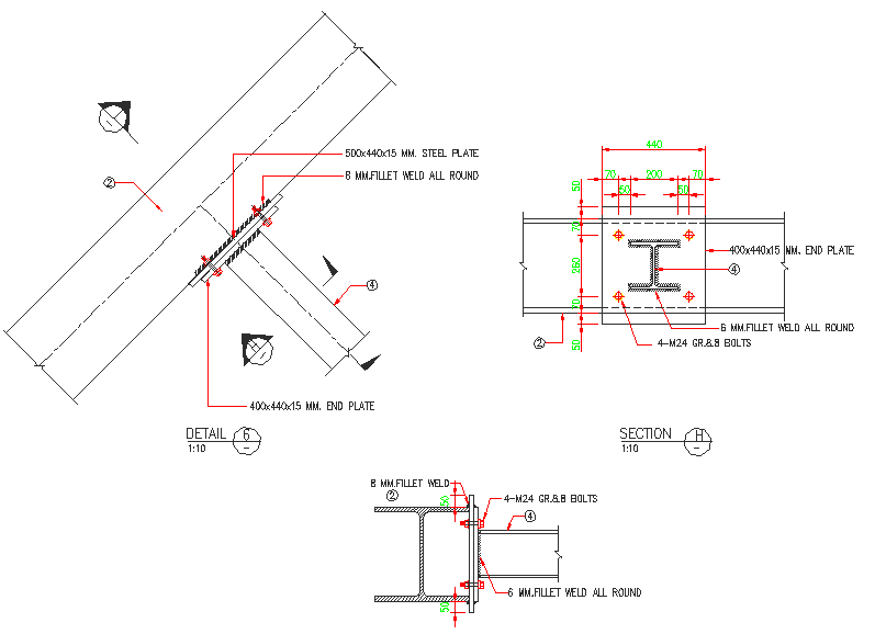Steel structure connection view detail dwg file, Steel structure connection view detail with specification detail, welding connection detail, plate connection detail etc
