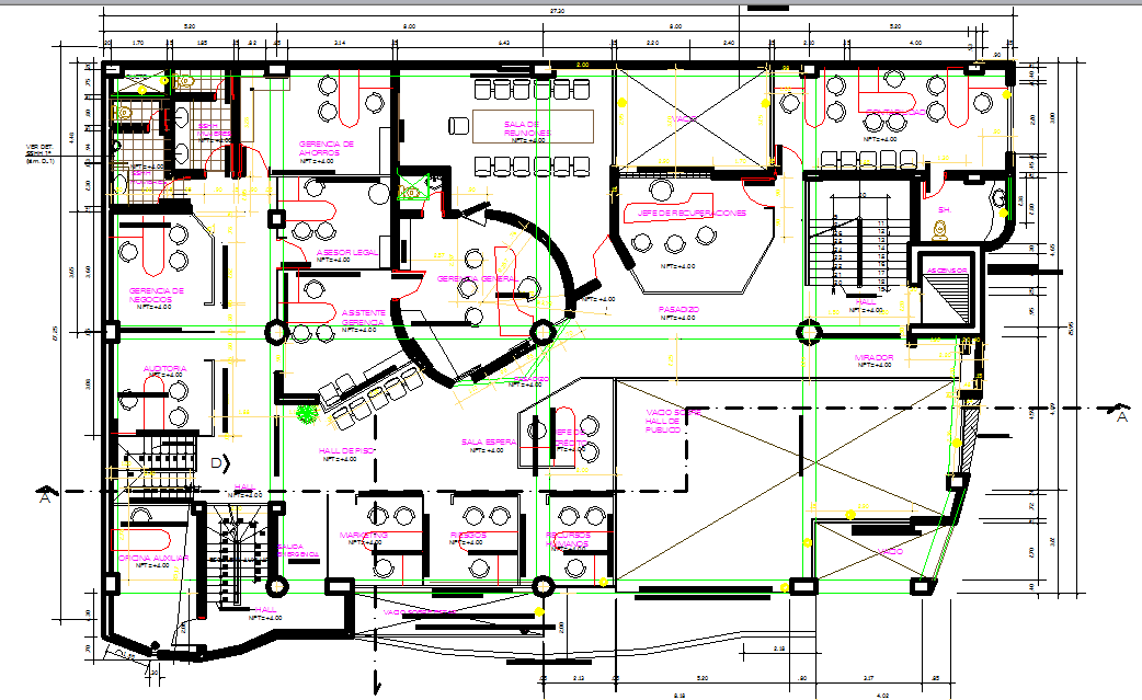 Office plan and elevation layout detail dwg file, Office plan and elevation layout detail with dimension detail, naming detail, landscaping detail with plant and tree detail, section line detail, etc.