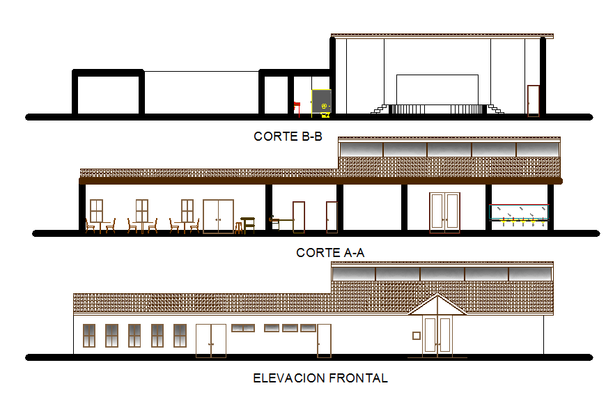 Elevation and section detail dwg file, Elevation and section detail with naming detail, both side tree detail, reeling detail, door and window detail, stair detail, etc.
